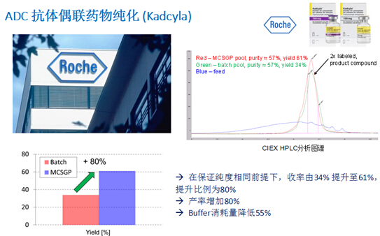 ? ? ??MCSGP(Multicolumn Countercurrent Solvent Gradient Purification)用于精純環節,可有效克服SMB(模擬移動床)僅適用于二元分離、無法實現線性梯度的缺點。