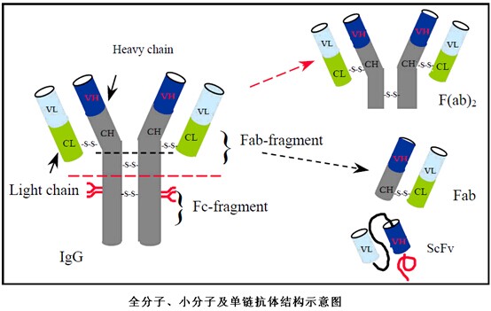 抗體的重鏈可變區(qū)以及輕鏈(VH+VL),通過一段多肽連接,形成單鏈抗體的可變區(qū)(ScFv)。穿透力強(qiáng)但往往親和力下降。分子量在~25kDa。Alexion?Pharmaceutical公司研制的Pexelizumab,主要用于治療冠狀動脈疾病。