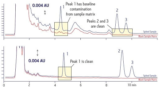 圖5給出了另一個(gè)示例。靠上的譜圖表明化合物#1和#2均受到樣品基質(zhì)引起的明顯干擾。靠下的譜圖表明使用SPE進(jìn)行適當(dāng)樣品制備后可顯著提高結(jié)果質(zhì)量(基線干凈)。請(qǐng)注意,一條明顯更干凈的基線可提高分析結(jié)果的準(zhǔn)確度。如果該樣品需要對(duì)化合物進(jìn)行分離和純化,那么也可以獲得一種純度明顯更高的萃取物。