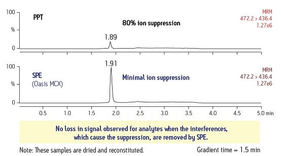 在有些情況下,源自樣品基質(zhì)的干擾物可能會(huì)增加某種化合物的信號(hào),這叫做離子增強(qiáng),可導(dǎo)致響應(yīng)值偏高。適當(dāng)?shù)腟PE方法可通過(guò)將干擾物與該化合物分離開(kāi)來(lái)而最大限度減弱這種效應(yīng),從而使響應(yīng)值更準(zhǔn)確。