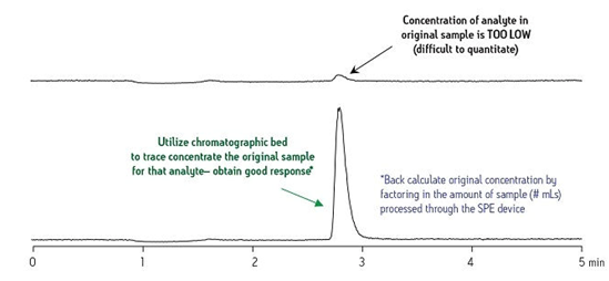 分析環(huán)境樣品中的痕量污染物或者代謝物在生物液體內(nèi)隨時(shí)間的變化情況就是一個(gè)可以說(shuō)明這一點(diǎn)的較好例子。圖9中靠上的圖譜表明使用原始純樣品進(jìn)行分析時(shí),目標(biāo)化合物的信號(hào)響應(yīng)差。通過(guò)以SPE作為痕量濃縮策略制備樣品后再使用相同的分析條件進(jìn)行分析后所獲得的靠下的圖譜表明這種化合物的信號(hào)強(qiáng)度顯著提高。根據(jù)這一結(jié)果,我們可以準(zhǔn)確計(jì)算出純樣品中的原始化合物濃度。
