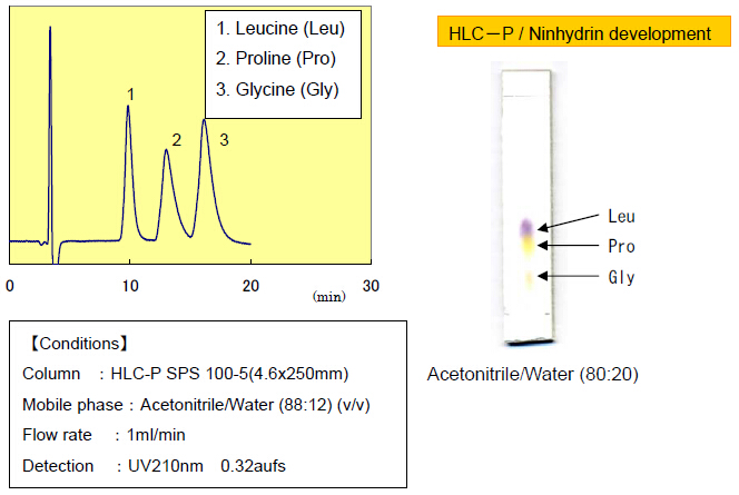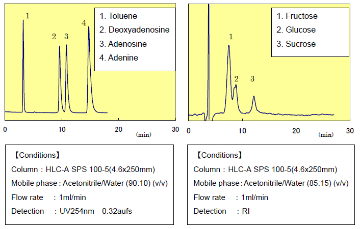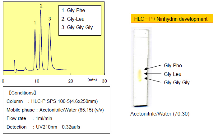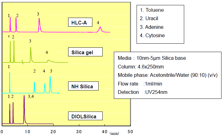 ????因此,對于極性化合物的洗脫,HILIC模式和反相模式是互補(bǔ)的。富士硅化學(xué)有限公司開發(fā)了兩款HILIC模式的填料,命名為“HLC”硅膠。兩種HLC硅膠都含有兩性的官能團(tuán),共價(jià)鍵合在硅膠表面。“HLC-A”用于分離純化有機(jī)酸、核酸和糖類;“HLC-P”用于分離氨基酸、多肽。