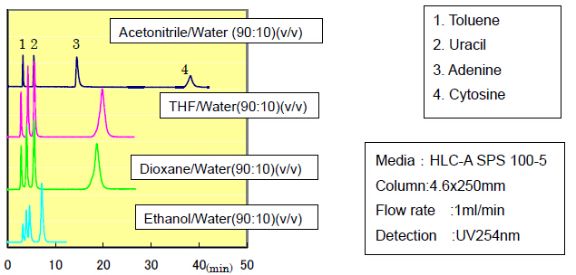 乙腈、THF和二氧六環(huán)通常溶解在水中作為流動相使用,而不會產(chǎn)生氫鍵相互作用。在高水相的條件下,洗脫時(shí)間變快。雖然反相體系常用于水溶性化合物的分離,但是HLC硅膠更適合用于極性化合物的分離。