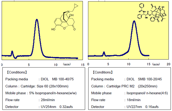 ?????? 富士公司經(jīng)過對二醇基硅膠的生產(chǎn)工藝和特性的研究,發(fā)現(xiàn)了普通硅膠在正相色譜中沒有的獨(dú)特性能。目前為止DIOL Silica已被廣泛用于分離有問題的化合物。