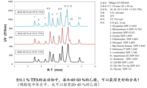 含0.1 % TFA的流動相分析疏水性高的多肽時,如果洗脫較遲,可以推薦使用醋酸溶液等。