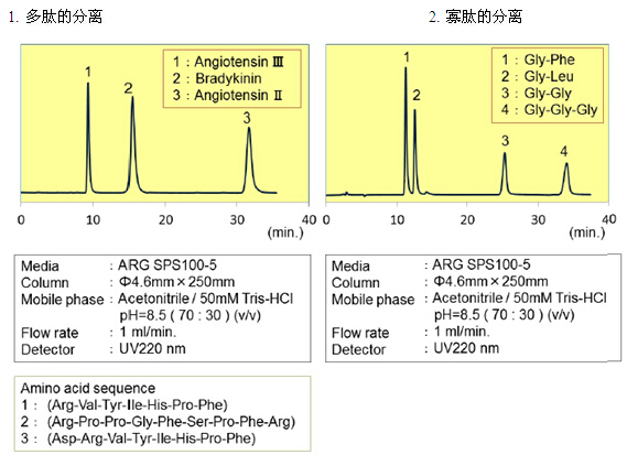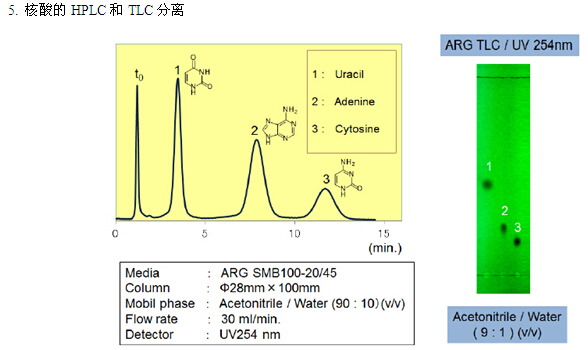 親水化合物一般是用反相模式來(lái)進(jìn)行分離,例如使用C18填料。但是,仍然有很多親水的化合物不能用普通的反相模式來(lái)分離。近些年來(lái),HILIC模式的填料應(yīng)運(yùn)而生,特別適合分離親水性化合物(極性大的化合物)。富士硅化學(xué)有限公司開(kāi)發(fā)了HILIC模式的“ARG硅膠”。ARG硅膠可用于分離氨基酸、多肽、維生素和核酸。不同粒徑的ARG硅膠可分別應(yīng)用于分析以及大規(guī)模的分離純化。