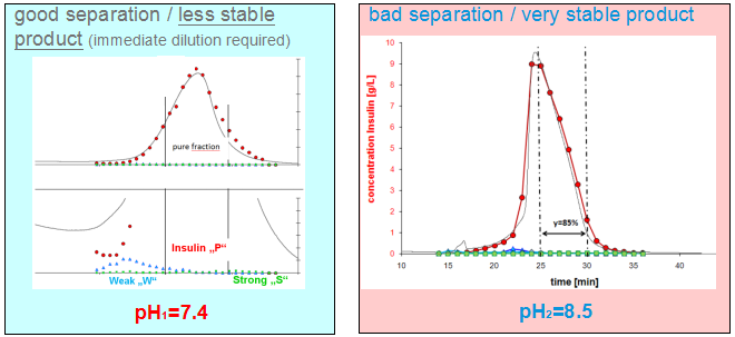 L.Aumann等采用MCSGP,在pH=8.5時將目標產(chǎn)物與降解物的重疊部分進行回收,不斷進行提純,同時保證了產(chǎn)品純度和收率。