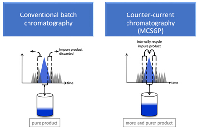 圖1. 傳統單柱層析(左):重疊組分被舍棄;MCSGP(右):重疊組分被在線回收,再次純化。