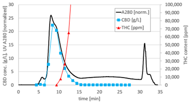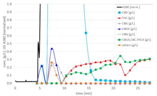 圖4. C18純化CBD過程圖譜,顯示UV280 nm、CBD濃度、THC含量(THC含量在10min左右開始顯著升高)