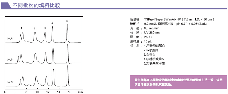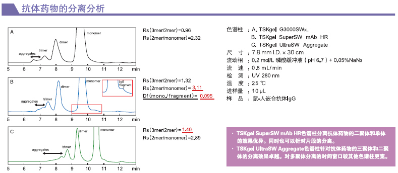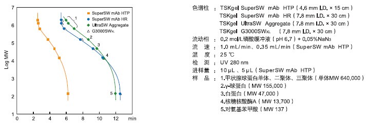 1. TSKgel SuperSW柱有內徑為4μm的顆粒,能實現最高分辨率。窄至4.6mm內徑的柱能在一定量的樣品質量范圍內提高高靈敏度。
