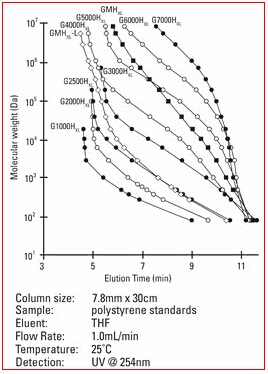 4. Hxl型柱屬于常規(guī)GPC色譜柱,尺寸為7.8mm ID ×30cm。大多數(shù)HPLC系統(tǒng)無需進(jìn)行特殊的優(yōu)化(針對(duì)柱外峰展效應(yīng)),即可使用常規(guī)的GPC色譜柱。