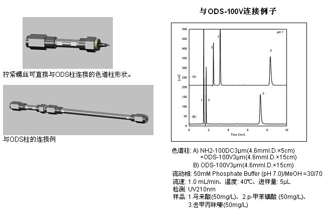 TSKgel NH2-100 DC 3μm 以鍵合了氨烷基的硅膠填料裝填了與后段的分析柱可以直接連接的色譜柱。不使用連接管也可連接2根色譜柱,可減少導致分離性能降低的死體積,2根分離模式不同的色譜柱的一體化,使用起來更方便。鍵合的氨基作為陰離子交換基發(fā)揮作用,協(xié)助完成后段色譜柱的分離,從而實現(xiàn)更好的分離成為可能。特別是與反相色譜柱的連接,醫(yī)藥品中的藥效成分和共存陰離子的同時分析成為可能。