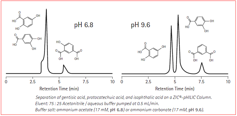親水作用色譜柱是一種直接分離極性和親水性化合物的色譜技術,為了便于理解,我們可以把它看作為是一種用反相色譜溶劑作流動相的正相色譜。因此,HILIC是親水性的流動相,以水、有機溶劑和緩沖鹽作為流動相。常見的HILIC方法采用50%~90%有機溶劑和一定比例的水,并且含有低濃度的緩沖鹽。如乙腈/水/醋酸銨體系。在HILIC方法中,洗脫順序和反相色譜正好相反,即極性越大,保留時間越長。