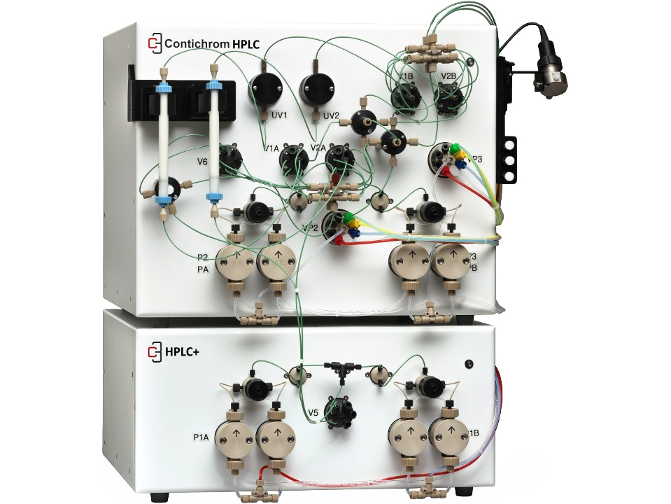 所有的Contichrom系統(tǒng)可以將兩個(gè)層析步驟(例如捕獲和精純)整合為一個(gè)單一的過程,第一步層析洗脫的產(chǎn)物可以直接被稀釋,從而直接進(jìn)行第二步層析,因此省略了中間的間歇過程,這是非常適用于高生產(chǎn)量純化的。