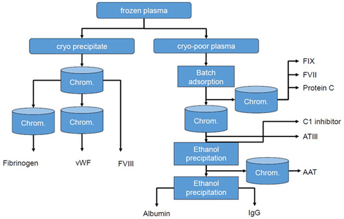血液制品分離需采用低溫乙醇沉淀分離法,各種蛋白在不同的條件下分步從溶液中析出。各組分精制則需采用層析方法,主要包括親和層析和離子交換層析。