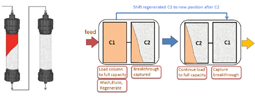 傳統(tǒng)親和層析工藝,由于流穿效應(yīng),有40-60%的填料是無(wú)法被利用的,從而使得載量和處理量大為受限。Capture SMB用于優(yōu)化捕獲環(huán)節(jié),作為最簡(jiǎn)單和最強(qiáng)大的2柱位設(shè)計(jì),可使純化效率顯著提高,并且使填料用量大為縮減。