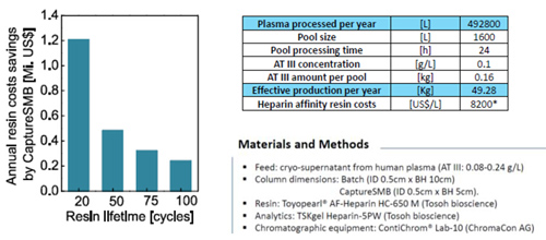 從預(yù)處理血漿中捕獲AT-III通常采用肝素親和層析法。將單柱Batch工藝與Capture SMB進(jìn)行對(duì)比實(shí)驗(yàn),使用親和填料TOYOPEARL? AF-Heparin?HC-650M,用血漿上清液(AT-III:0.08-0.24 g/L)進(jìn)行上樣,采用TSKgel Heparin-5PW分析柱進(jìn)行濃度測(cè)定,最終研究表明,采用Capture SMB,可使填料載量提高45%,產(chǎn)率提高38%,同時(shí)使緩沖液消耗量降低29%。