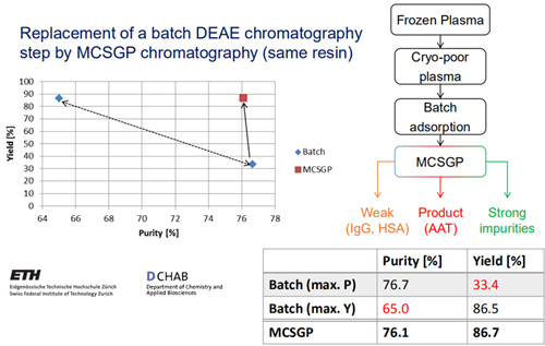 從血漿中純化AAT需采用DEAE離子交換層析,有研究表明,采用單柱Batch工藝純化AAT,產(chǎn)品純度76.7%時(shí),收率為33.4%;產(chǎn)品純度65.0%時(shí),收率為86.5%,純度和收率此消彼長(zhǎng)。采用MCSGP工藝后,可在產(chǎn)品純度76.1%時(shí),仍保證收率為86.7%。