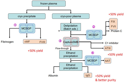 連續(xù)流層析可應(yīng)用于血液制品純化的多個(gè)階段,有效提高純化效率,改善收率和純度,詳見下圖: