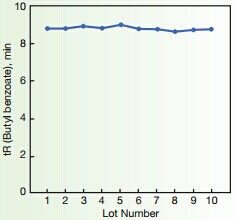 ??? 上圖顯示了疏水性作用的10批生產(chǎn)的批間再現(xiàn)性,這是色譜柱的基本參數(shù),通過對(duì)生產(chǎn)過程的嚴(yán)格控制,獲得極穩(wěn)定的批間再現(xiàn)性。其顯示了非常高的批次間重復(fù)性,在分析丁苯時(shí)候,以10批柱子的數(shù)據(jù)為例,保留時(shí)間的標(biāo)準(zhǔn)偏差小于1.5%,這數(shù)據(jù)大大低于普通的C18色譜柱。分析標(biāo)準(zhǔn)物質(zhì)時(shí),每根色譜柱的理論塔板數(shù)可達(dá)18600,壓力為2600psi。